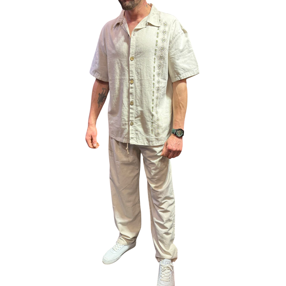 Gömlek Pantolon Nakışlı Keten Erkek Takım Beyaz Renk