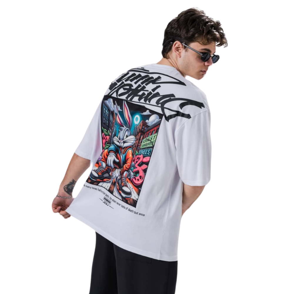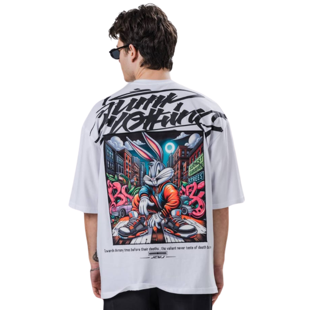 Owersize Kesim Yıpranmaz Dijital Baskı Bugs Bunny T-Shirt Beyaz Renk